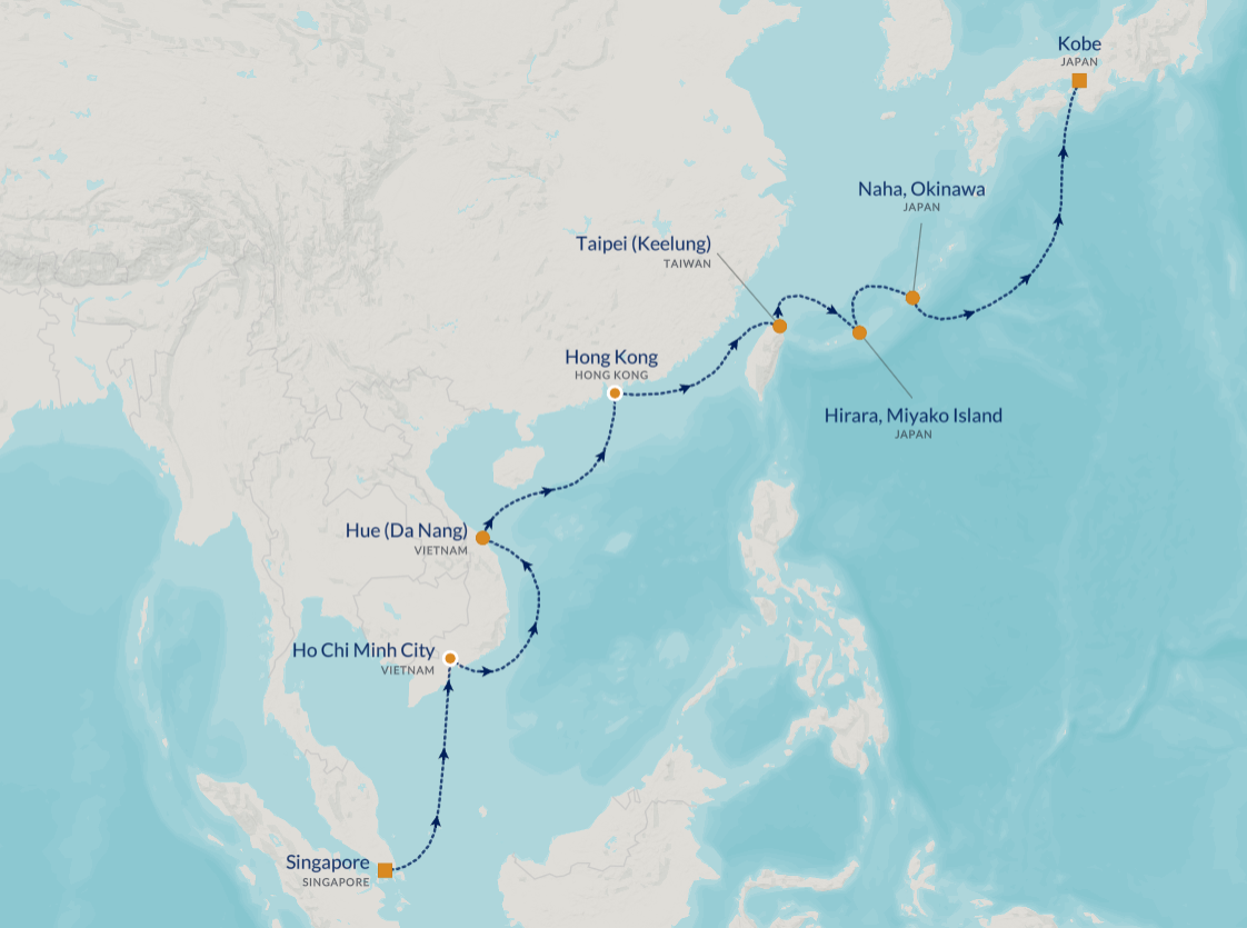 Bli med på en eksepsjonell 14‑netters reise om bord på Azamara Pursuit. Reisen starter i pulserende Singapore, før dere seiler gjennom rolig sjødager til autentiske Vietnam–havner som Ho Chi Minh City, Nha Trang og Da Nang, hvor dere får rikelig tid til å utforske både historisk arv og klimavenlig strandliv. Videre venter et fengslende opphold i livlige Hong Kong, med to hele dager til shopping og ikonisk byutforskning. Turen fortsetter til Taiwans hovedport Keelung ved Taipei, samt unike, mindre kjente perler som Miyakojima (Hirara) og Okinawa (Naha) – perfekte for kulturelle opplevelser og tropiske innslag. Deretter nyter dere flere rolige sjødager før reisen avsluttes i Kobe – inngangsporten til magiske Kyoto.