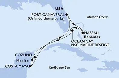 Når MSC Grandiosa seiler ut fra Port Canaveral, starter et cruise fullt av varme karibiske rytmer, hvite strender og fargerike byer. Kombinasjonen av Floridas ferieatmosfære og Karibias tropiske øyverden gir reisen en herlig balanse mellom energi og avslapning. Dette er cruise på sitt beste. Ombord på MSC Grandiosa venter et moderne og elegant cruiseskip med en spektakulær LED-himmel over promenaden, et stort utvalg restauranter og barer, et levende underholdningstilbud og deilige bassengområder som gjør dagene til rene ferieopplevelser i seg selv. I land møter du ikoniske cruisedestinasjoner som er kjent for krystallklart vann, spennende utflukter og alt fra avslappende strandliv til pulserende kultur og shopping. Skipet seiler hver lørdag og du kan velge mellom Østlige – og Vestlige Karibia. Kombiner gjerne cruiset med fantastiske Orlando med sine verdensberømte fornøyelsesparker.