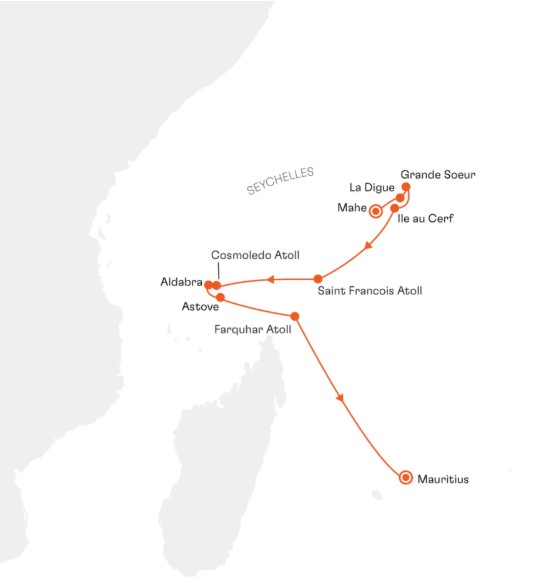 Dette unike ekspedisjonscruiset tar deg med gjennom noen av de mest eksklusive og uberørte øyområdene i Det indiske hav. Reisen starter i Victoria på Mahé på Seychellene, før du seiler videre inn blant de vakre Inner Islands, hvor steder som La Digue, Grande Soeur og Île au Cerf byr på kritthvite strender, granittklipper, turkist hav og den avslappede øyatmosfæren Seychellene er så berømt for. Her er det naturen, stillheten og følelsen av å være langt borte fra hverdagen som står i sentrum.