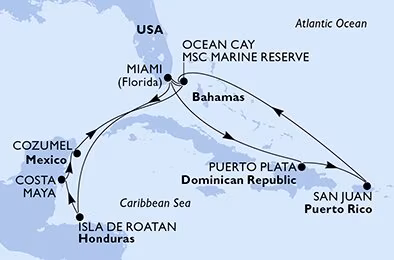 Cruiset starter og avsluttes i solfylte Miami, og tar dere til følgende destinasjoner: Puerto Plata (Den dominikanske republikk), San Juan (Puerto Rico), det private MSC-paradiset Ocean Cay, tilbake til Miami før cruiset går videre til Costa Maya, Isla de Roatan og Cozumel og en ekstra stopp på Ocean Cay – før dere returnerer til Miami. Ocean Cay er en fantastisk privat øy og her får dere to dager til strandliv og opplevelser.