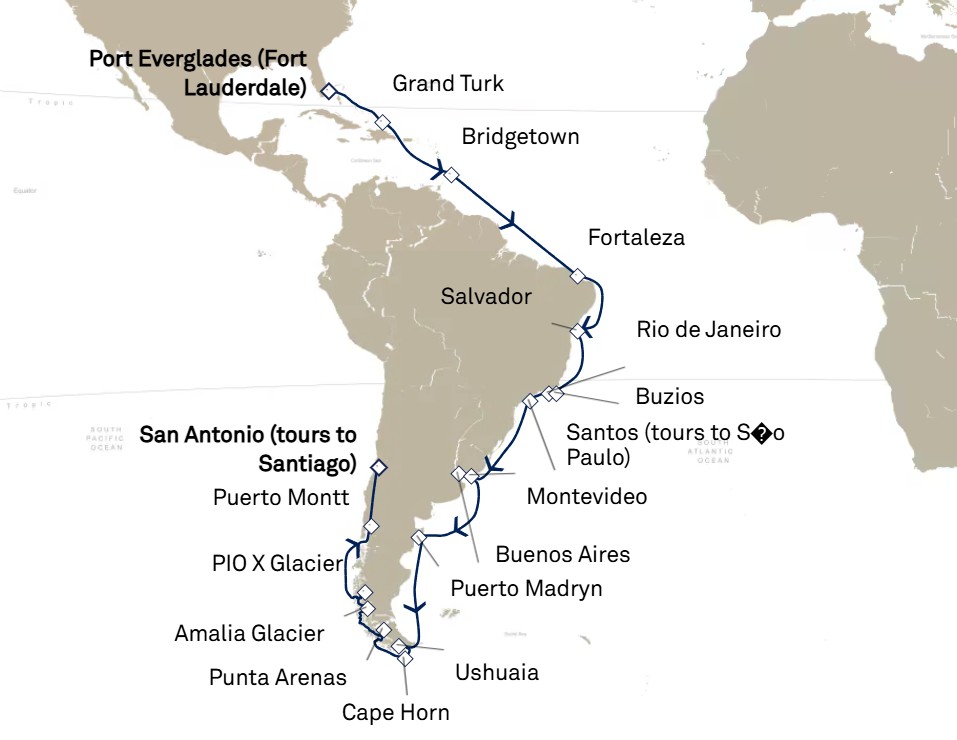 Underveis besøker du ikoniske reisemål som Grand Turk og Barbados, før kursen settes mot Sør-Amerika. I Brasil venter fargerike perler som Salvador de Bahia, verdensberømte Rio de Janeiro, og den sjarmerende kystbyen Búzios. Videre går seilasen innom Santos, med mulighet for utflukt til São Paulo, før du utforsker Montevideo i Uruguay og pulserende Buenos Aires i Argentina.