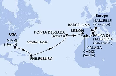 Når MSC Meraviglia seiler fra Miami tilt Barcelona, får du en reise som elegant kombinerer tropiske vibber i Florida med middelhavets kultur, gastronomi og historie. Cruiset over Atlanterhavet gir deg rikelig med tid til å nyte skipets imponerende fasiliteter – den spektakulære promenaden under LED-himmelen, et generøst utvalg restauranter, show i toppklasse, spa, bassengområder og rolige dager der havet er din nærmeste nabo. Underveis stopper MSC Meraviglia på idylliske øyer og i stemningsfulle byer som gir kontraster mellom palmestrender, turkisblått vann og europeiske storbyopplevelser. Når du ankommer Barcelona, avsluttes cruiseopplevelsen i en av verdens mest levende kulturmetropoler.