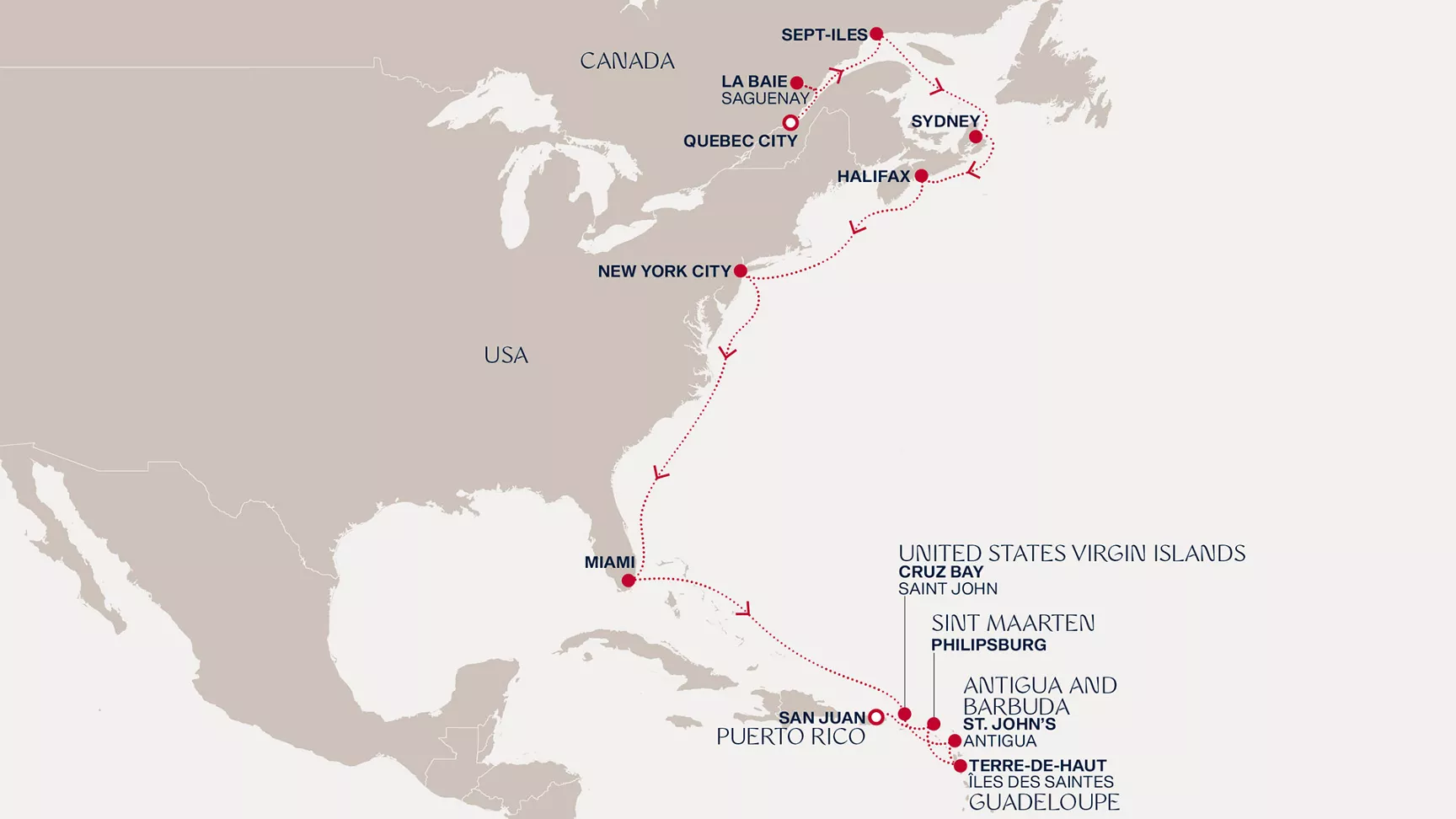 Denne langturen med helt nye EXPLORA III starter fra historiske Quebec City, med brosteinsgater, historie og europeisk atmosfære, før du seiler videre til La Baie og Sept-Îles, små kystperler omgitt av vill natur og storslåtte fjorder. Deretter venter Sydney og Halifax i Nova Scotia, med sjarmerende havnefronter, sjøfartshistorie og vakker kystlinje, før skipet glir inn mot ikoniske New York City og glamourøse Miami. Når du setter kursen sørover mot Karibia, byttes storbylys med tropisk idyll: myke strender og turkis hav ved Cruz Bay, avslappet øystemning på Antigua, fransk-karibisk sjarm på Terre-de-Haut, fargerike gater og shopping i Philipsburg, før reisen avrundes i livlige San Juan i Puerto Rico. Totalt opplever du 12 havner i 7 ulike land på én og samme reise.