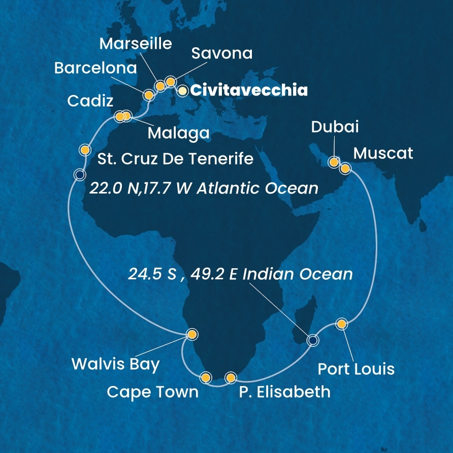 Se for deg å gå ombord i elegante Costa Smeralda i historiske Roma – og våkne opp til stadig nye kulturer, klima og kontraster på reisen mot spektakulære Dubai. Dette er cruiset som kombinerer klassisk europeisk sjarm med eksotisk luksus i Midtøsten, alt pakket inn i komforten til et av Middelhavets mest moderne cruiseskip. Du seiler rundt Afrika og besøker Walvis Bay, Cape Town og ikke minst fantastiske Mauritius.