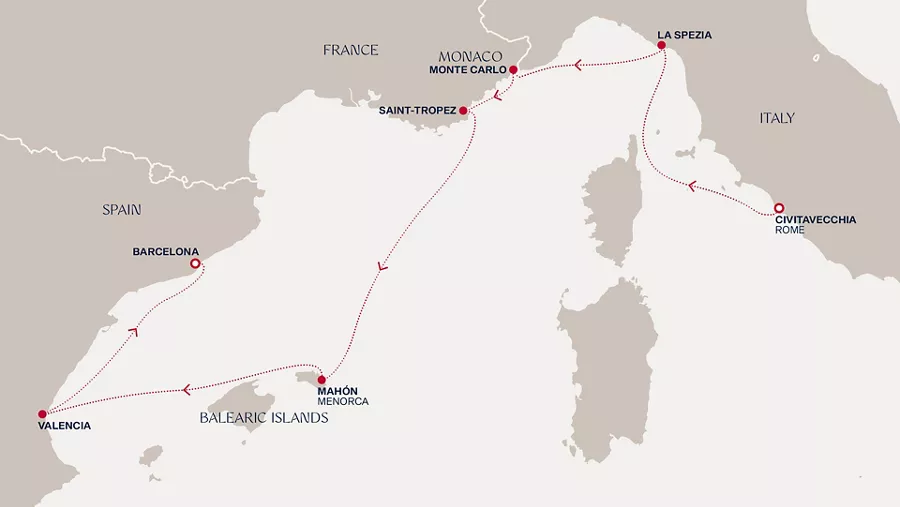 Videre ankommer du ikoniske Saint-Tropez, kjent for sin franske riviera-glamour og avslappede strandliv. Turen går så til idylliske Mahón på Menorca, en spansk øyperle med roligere tempo, historisk havn og krystallklart vann.