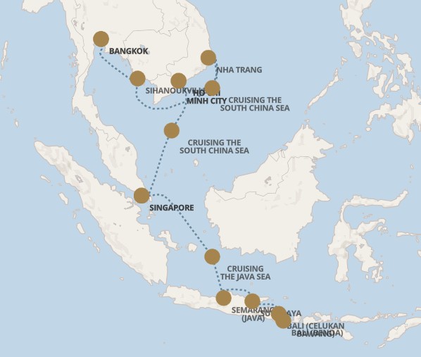 Cruiset inkluderer stopp i Bali, Java‑byen Surabaya og koloniale Semarang, før majestetisk seilas gjennom Java‑havet til pulserende Singapore, og videre til Ho Chi Minh‑byen, vakre Nha Trang, eksotiske Sihanoukville, og avslutning i Thailand .