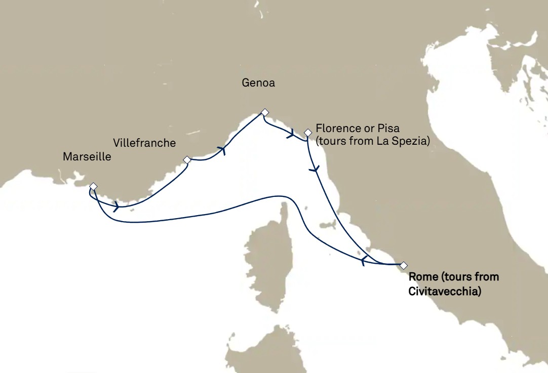 Allerede etter en rolig dag til sjøs ankommer du Marseille, hvor du kan utforske provençalsk kultur, livlige havneområder og historiske gater. Videre venter idylliske Villefranche, en av Rivieraens vakreste perler, før reisen fortsetter til Genova, en autentisk italiensk havneby rik på historie og gastronomi. I La Spezia åpner døren seg til noen av Italias største høydepunkter, med mulighet for utflukter til både Firenze, Pisa eller de fargerike landsbyene i Cinque Terre.