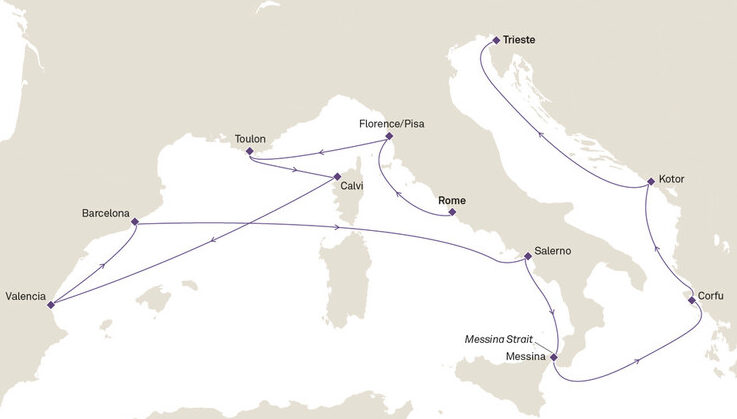 Deretter venter nye opplevelser sør i Italia, med stopp i Salerno – et perfekt utgangspunkt for utflukter til Pompeii eller Capri, før skipet transitter gjennom Messinastredet og legger til i Messina på vakre Sicilia. Reisen fortsetter til frodige og greskinspirerte Corfu, før du får en dag i spektakulære Kotor i Montenegro – en fjordlignende perle omringet av fjell og middelalderarkitektur.