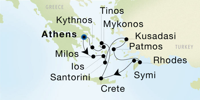 Du går om bord i Athen (Piraeus), deretter åpner seg en seilas som bringer deg til skjønne Milos, Ios og den ikoniske Santorini, med sine spektakulære solnedganger og bratte, hvitkalkede landsbyer. Turen går videre til Kusadasi i Tyrkia – Ephesos’ antikke ruiner venter for historieentusiasten. Patmos, Lindos på Rhodos, Symi, Heraklion på Kreta, Tinos og Mykonos følger, med en overnatting på Mykonos for å nyte byens pulserende atmosfære. Til slutt returnerer du til Athen, rik på inntrykk og minner.