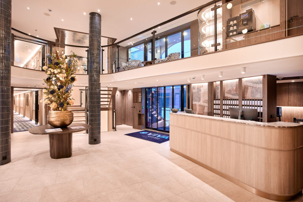 Eksempel på baderom på lugar: Alle lugarer har elegante baderom med rituals skjønnhetsprodukter, badekåper og tøfler.